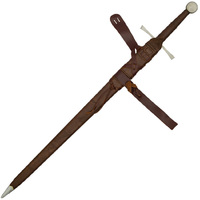 45" (114.3cm) overall. 36" (91.44cm) satin finish blade. Brown leather wrapped handle. Steel guard and pommel. Weight: 2.5lb. Replica of a 13th century long sword. EN42J spring steel blade. Wooden scabbard features integrated leather belt. Brown leather scabbard. Boxed.