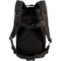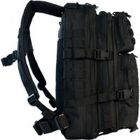 Measures: 9 1/2" x 12 1/2" x 18". 600 Denier PVC lined polyester construction. Pack has four expanding compartments that provide up to 20 liters of storage. Internal dividers and zippered pockets are built in the three largest compartments. The mesh padded back panel can hold up to a 2.5 liter hydration bladder (bladder not included). The contoured shoulder straps are constructed with mesh padding and are fully adjustable. Adjustable waist strap and sternum strap evenly distribute the weight of the load. MOLLE system straps armor this bag with points for customization. Reinforced carry handle. Mesh ventilated padded back with Velcro top closure. Shoulder straps have hard plastic D-rings for attachments. Four quick release compression straps for expansion and consolidation. Medium 2 liter external organizer pocket. Velcro keepers for excess strap slack. Weight: 2.5 lbs. Color: Black.
