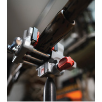 Ball head design. Tensioning handle for easy adjustment. Ergonomic friction knob. Versatile mounting base. Soft non-marring urethane material protects stock finish. 3" jaw opening. Smooth sliding jaw with bronze bearings and machined lead screw. Smooth stainless jaws with integrated Pic/Arca Swiss rail slot. Boxed.