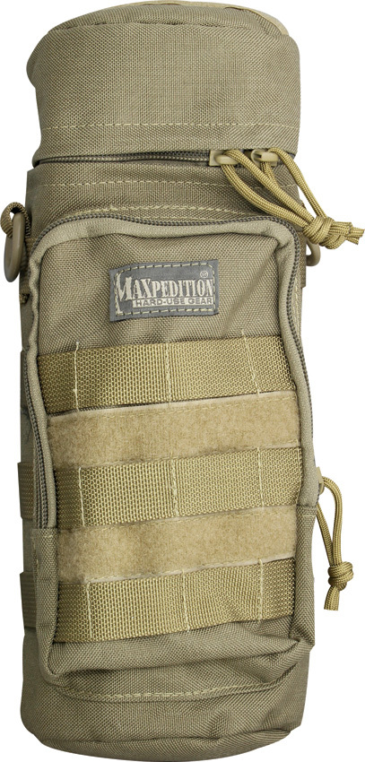 This 12" x 5" bottle holder will hold a tall insulated container or a bottle of wine (750ml). Main compartment: 12" high x 5" diameter, padded, with drainage grommet. Frontal: 7" x 4" x 1.5" with elastic retention. PALS attachment webbing: Front and sides. Attachment-1: D-rings for optional shoulder strap. Attachment-2: 5" TacTie (sold separately). Attachment-3: Keyper quick release hook on back. Bulk packed. Maxpedition Hard Use Gear is constructed of 1000-Denier water and abrasion resistant light-weight ballistic nylon fabric treated with Teflon fabric protector for grime resistance and easy maintenance. Uses high tensile strength composite nylon thread (stronger than ordinary industry standard nylon thread). #AS-100 high grade closed-cell foam padding material for superior shock protection. High tensile strength nylon webbing. #10 high strength zippers and zipper tracks. UTX-Duraflex nylon buckles for low sound closures. All items shown with the Maxpedition products are for display purposes only. They are not included with the product.