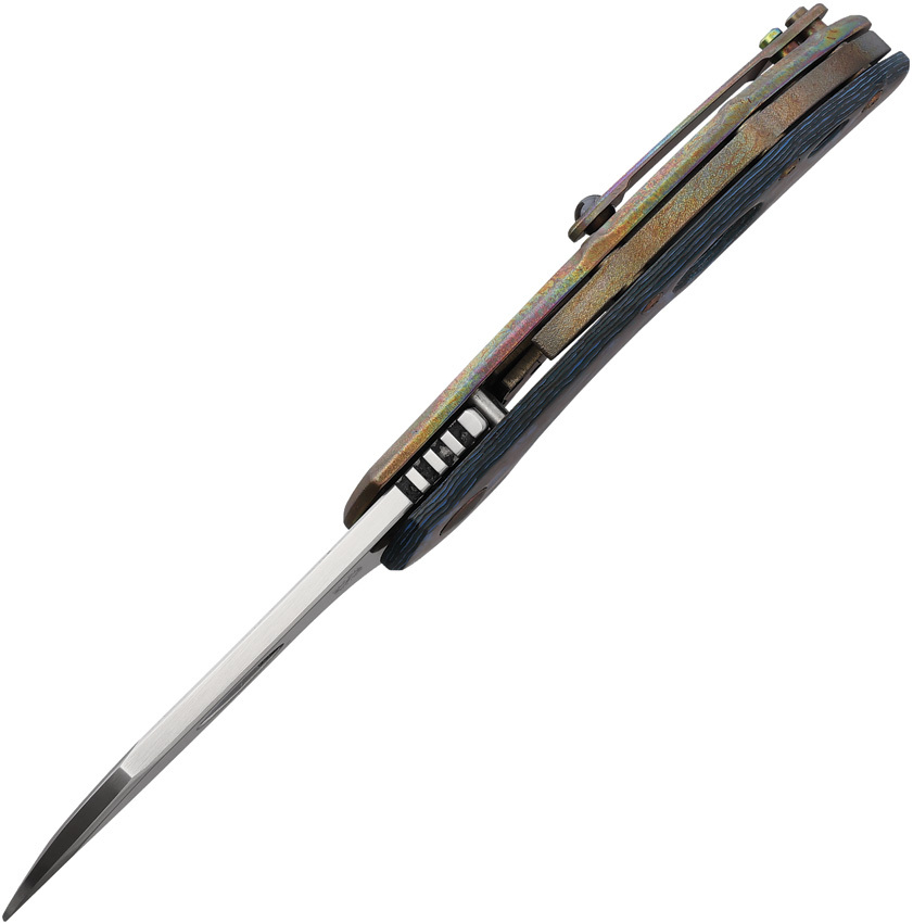 3.5" (8.89cm) closed. 2.38" (6.05cm) satin finish MagnaCut steel sheepsfoot blade. Arctic storm (black and blue) carbon fiber handle with Acid rain titanium back handle. Thumb pull. Extended tang. Lanyard hole. Pocket clip. Zippered storage case.