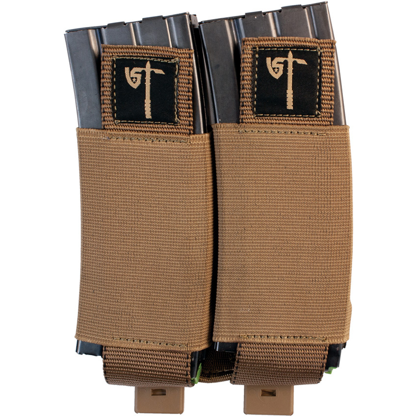 4" elastic webbing. Low profile and lightweight design. Two secure compartments for carrying radios, magazines, phones, or other small equipment. Affixes to MOLLE or belt with included 6" MALICE clip. Color: Coyote Brown. Hang packaged.