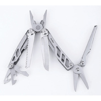 4.25" closed. 6.5" overall. Stainless handle. Tools include: Needlenose pliers l Pliers l Wire cutter l Saw blade l Small blade l Phillips screwdriver l Wire stripper l Can opener l Bottle opener l Flat head screwdriver l Glass breaker l Scissors l Ruler l Replaceable hard wire cutters I Thick wire cutters I Line cutter. Black nylon pouch. Clam packed.