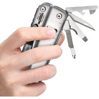 4" closed. 6.25" overall. Stainless handles. Tools include: Wire cutter l Pliers l Needlenose pliers l Phillips screwdriver l Ruler l Wire stripper l Reamer l Bottle opener l Can opener l Pry bar l Awl l File l Flat head screwdriver l Saw blade. D2 steel blade I Whistle I Flint stone. Black nylon belt sheath. Boxed.