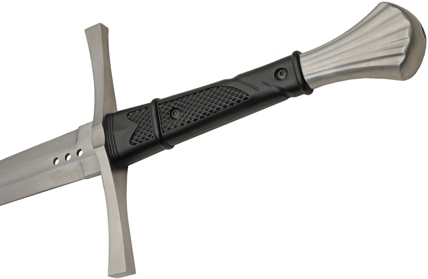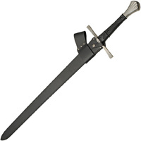 44.25" (112.4cm) overall. 33.5" (85.09cm) satin finish 1060HC steel blade. Black TPR handle. Stainless guard and pommel. Fleur-shaped pommel. Black leather scabbard. Boxed.