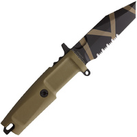 9.5" (24.13cm) overall. 4.25" (10.8cm) desert warfare finish Bohler N690 stainless tanto blade. Tan Forprene handle. Full tang. Lanyard hole. Glass breaker. Tan molded plastic multi-mount belt sheath. Boxed.