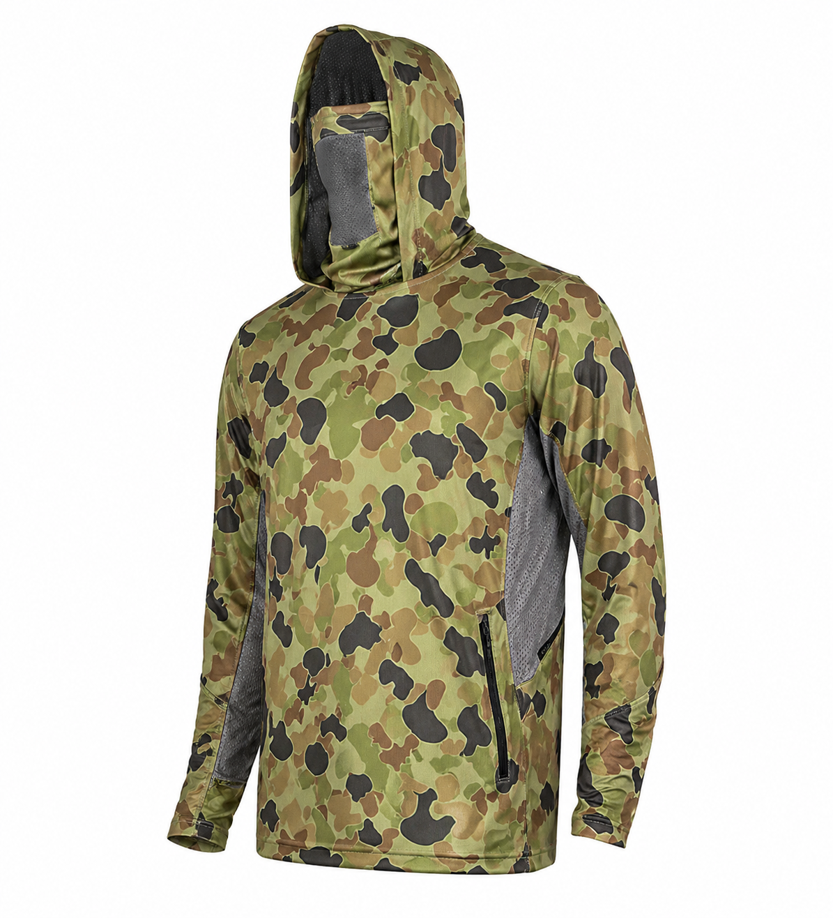 The integrated hood and face gaiter adds extra protection from sun, wind, and insects, while the Australian-specific camo pattern is designed to blend seamlessly into bush, grassland, and arid environments. Whether you’re glassing ridgelines, moving through timber, or setting up for a shot, it helps break up your outline without sacrificing mobility.