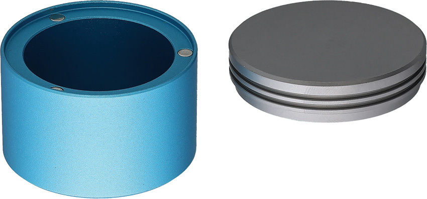 Sky blue anodized finish aluminum body. Stainless cap held in place with three neodymium magnets. Can be used to store any small items. Outside dimensions: 1.56" diameter; 1.25" height. Inside dimensions: 1.18" diameter; 1.14" height. Comes in foam-lined plastic tube.