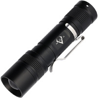 4" overall. Water resistant. Impact resistant. Strobe. Clip. Lanyard. High power LED. 160 max lumens. Special steel optical lenses. Explosion proof. Adjustable beam. UV mode. Requires (1) AAA battery (included). Aluminum construction. Color: Black. Boxed.
