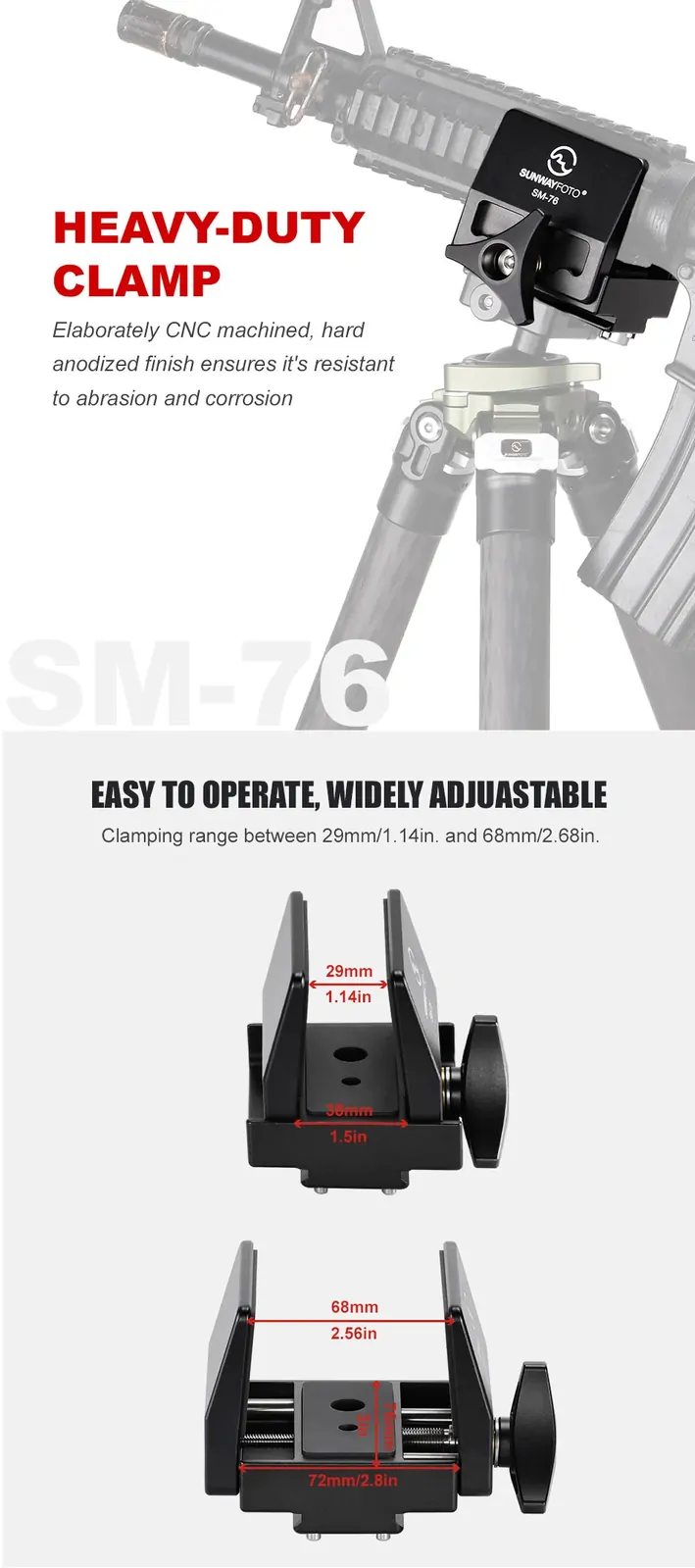 ✪ Lightweight design, weighing only 16.2oz(460g).3.62*3.23*3.27 inch(92*82*83mm), compatible with equipment width between 1.14inch (29mm) and 2.68inch (68mm) .