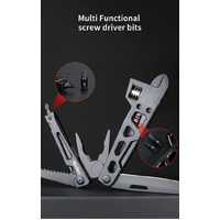 5.25" closed. Stainless handles. Tools include: Wrench l Needlenose pliers l Pliers l Wire cutter l Flat head screwdriver l Phillips screwdriver l Saw blade l Large blade. Boxed.